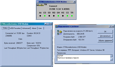 индикатора отображающих состояние модема. Один стандартный Windows,